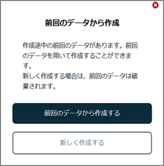 入力したデータが保存されている場合、ログイン後にメッセージが表示され、前回のデータを使用して作成を再開するか、新しく作成するかを選択できます。