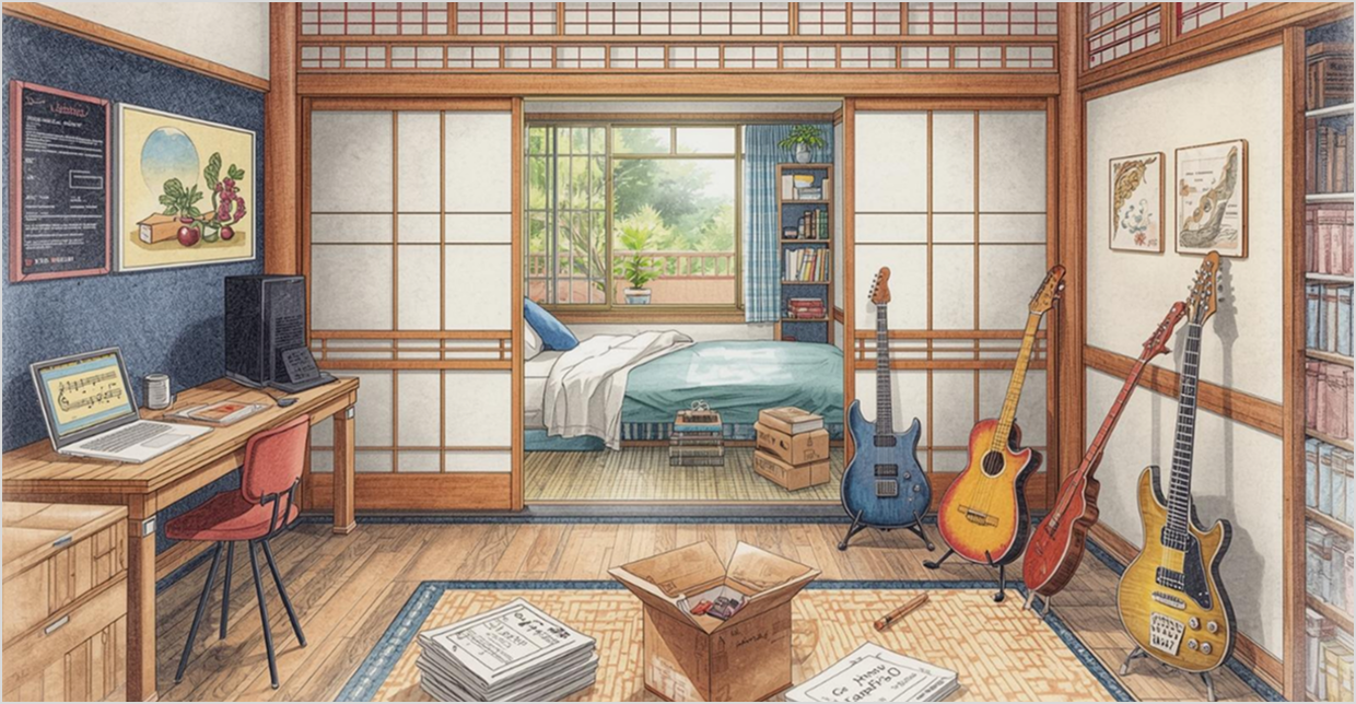 まず、部屋に入るとギターが沢山ありました。また、引き出しの中は楽譜やカセットテープが段ボールの中に詰めてありました。